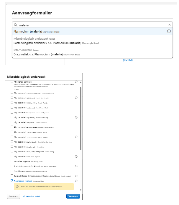 Malaria diagnostiek is CITO (spoed) en moet altijd telefonisch worden aangevraagd via de Arts-Microbioloog (033-8502929).